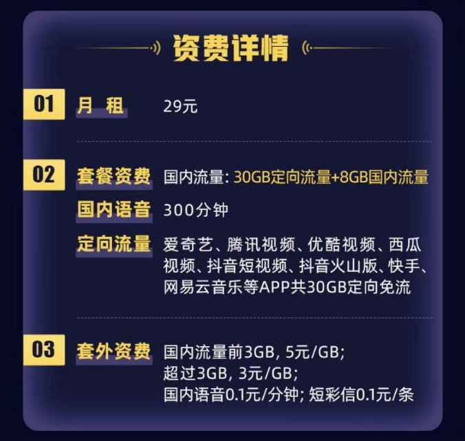 流量:30G定向流量 8G国内通用流量(套外流量收费标准:前3G、5元/GB、超过3G、3元/GB,套餐外流量有效期一个月,低于1MB不计费)