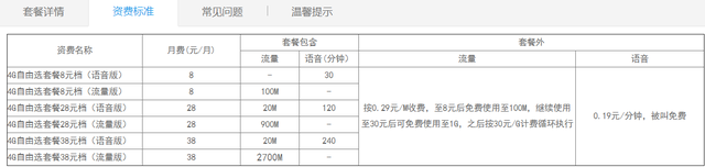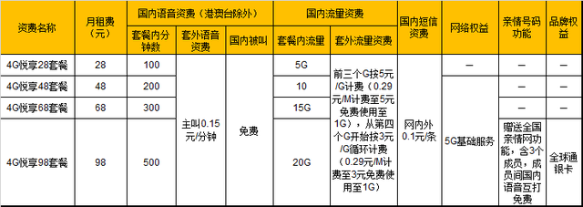 4G悦享套餐则一共有四档,最低28元/月,最高98元/月,流量最低5G/月,最高10G/月。